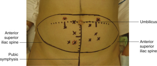 The major anatomic landmarks are the umbilicus, both anterior superior iliac spines (ASIS), and the pubic symphysis ( Fig. 57.6 ).