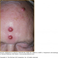 The initial site of the infection is usually on the feet, legs, arms, or upper trunk. The clinical features vary.17 The initial lesion is often a warty papule that expands slowly over months or years (Figs. 190-6 and 190-7). Alternatively, lesions may be plaque-like with an atrophic center. The more common verrucous form spreads slowly and locally. Individual lesions may be very thick and often develop secondary bacterial infection. Satellite lesions around the initial site of infection are local extensions of the infection and usually are produced by scratching. Complications of chromoblastomycosis include local lymphedema, leading to elephantiasis and squamous carcinomas in some chronic lesions.