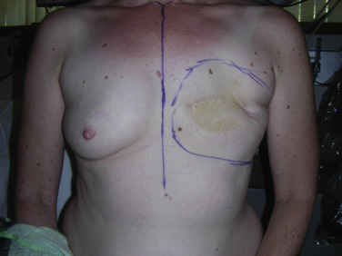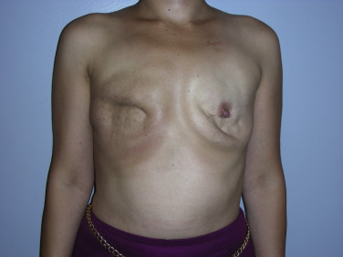 A thorough discussion should be had with the patient prior to undergoing delayed implant-based breast reconstruction. A careful physical exam must also be performed, and key factors highlighted, such as missing pectoralis major muscle or serratus anterior muscle, quality of overlying skin, and potential regional coverage options such as the latissimus dorsi muscle ( Fig. 13.2 ). Expectations must also be addressed, including initial or final breast shape and size. Patients should be counseled that delayed reconstruction in the setting of limited skin pliability can lead to a slower or difficult expansion process as well as result in a less natural shape of reconstructed breast, especially lack of a well-defined inframammary fold.