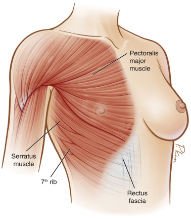 It is also important to emphasize need for total muscular coverage of the implant. In this manner, the pectoralis major muscle, serratus anterior muscle, as well as fascia of the rectus abdominis should be present. This will ensure that in cases of skin breakdown no implant is directly exposed. However, this also poses a risk for high-riding implants from the forces exerted by the overlying muscles. Patients must be informed of these risks as well as the postoperative discomfort and soreness that will result from the above-noted dissection.