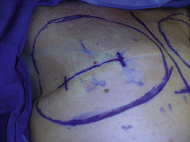 The borders of the breast as well as its “footprint” will be transposed inside on top of the chest wall and muscles to help recreate the implant pocket. The two key areas are the inframammary fold and anterior axillary line, as this will require dissection of the serratus anterior muscle and rectus fascia in order to define the fold and lateral extent of the new breast. The transposed markings will also serve to guide muscle elevation and submuscular pocket dissection.