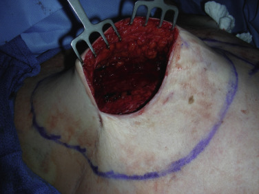 The surgical exposure for delayed implant-based reconstruction is created through the prior well-healed mastectomy scar. However, only a portion of the original incision may be used during the reconstruction ( Fig. 13.5 ). Prior to incision, the incision is infiltrated with 1% lidocaine with epinephrine. The procedure begins by making the incision through the skin and subcutaneous tissue down to the prepectoral fascia. Using sharp dissection and lighted retractor, the skin flaps are elevated to the borders of the pre-marked breast border to create the soft tissue envelope ( Fig. 13.6 ). Next, the lateral border of the pectoralis major muscle is identified and from here, the muscle is raised. Again, be sure to achieve adequate hemostasis from any perforating vessels during this dissection. Care must be taken with dissection underneath the pectoralis major muscle to avoid injury to the thoracoacromial artery. It is also wise to avoid cautery dissection directly on top of the ribs, as this will lead to increased postoperative pain.