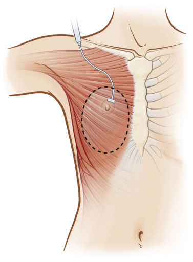 Total muscular coverage requires dissection to raise the pectoralis major muscle as well as the adjacent serratus anterior and the rectus abdominis fascia ( Fig. 13.3 ). The pectoralis major muscle has origins from the medial half of the clavicle, the sternum, the costal cartilage from the first to sixth ribs, and from the aponeurosis of the external oblique muscles. The fibers insert into the bicipital groove of the humerus. The blood supply is from the thoracoacromial artery which lies on the deep surface of the muscle. The serratus anterior muscle originates from the first through eighth ribs and has multiple slips that insert into the medial edge of the scapula. The rectus abdominis fascia lays inferior to the pectoralis muscle. The fascia can be dissected off the muscle belly in order to provide inferior implant coverage.