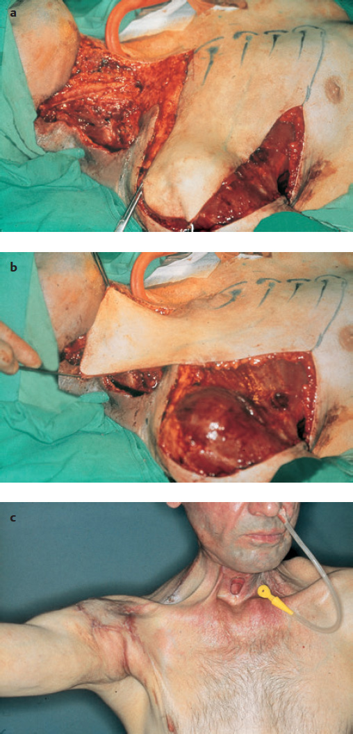 a–c Deltopectoral flap for neck defect reconstruction after radiation treatment. a The flap is incised (see Fig. 12.1a , 5) and extended to the shoulder. b The cervical defect is covered. c Result after weeks.