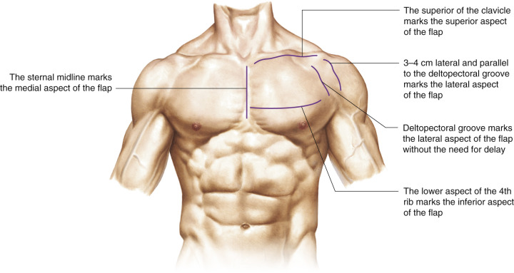 • The lateral edge of the sternum ( Fig. 35.1 ) marks the medial aspect of the flap, the clavicle marks the superior aspect of the flap, the lower aspect of the 4th rib denotes the inferior aspect of the flap, and the lateral aspect of the flap, without a delay procedure, is 3–4 cm lateral and parallel to the deltopectoral groove.