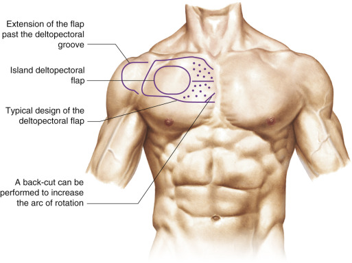 • The flap can be designed based on any of the internal mammary perforators and oriented in a lateral, oblique, or inferior direction. The lateral direction toward the acromial process allows for the furthest extension of the flap, whereas the other two designs are limited in length unless a delay is performed.