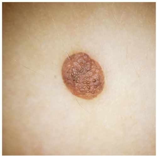 defined when the vertical and horizontal axes are comparable, and the verrucous type consists of any combination of 3 previously discussed types.12 The surface of these nevi can be either smooth or coarsely papillated.14 Melanocytes are located primarily in the dermis, although junctional nests may exist. Melanocytes should mature and change from epithelioid to more lymphocyte-like as they descend deeper into the dermis. They can also become thinner, elongated, and schwannian in the deep dermis as well. There may be an accompanying terminal hair and/or large sebaceous glands.14
