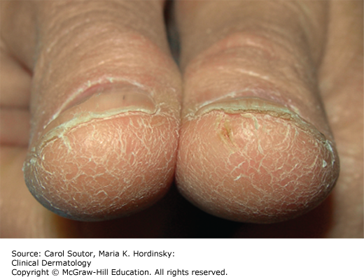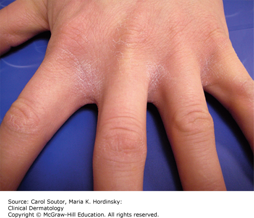 Irritant contact dermatitis is often well demarcated with a glazed appearance, but there may also be erythema, swelling, blistering, and scaling. Initially, irritant reactions are usually confined to the site of contact with the irritant. The most common locations are hands, forearms, eyelids, and face (Figures 8-1, 8-2, 8-3).