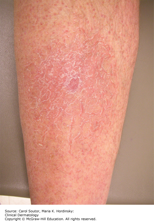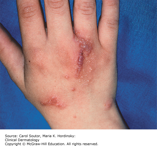 Acute allergic contact dermatitis classically presents as papules and vesicles on an erythematous base (Figures 8-4 and 8-5).