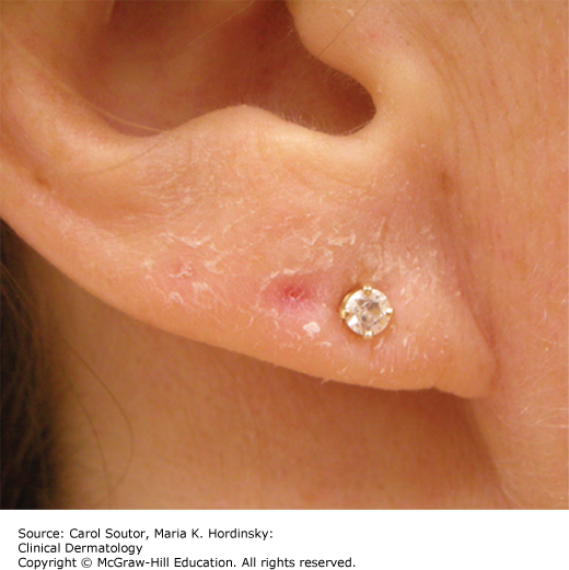 In general, allergic contact dermatitis occurs at the site of contact with the allergen. Nickel allergy usually results in dermatitis underlying nickel-containing objects (Figure 8-6) (eg, jewelry—earlobes, neck, wrists; belt buckles—umbilicus; cell phones—cheeks). However, dermatitis in certain sites, especially the eyelids and face, may result from contact to allergens on the hands (fingernail polish) or scalp (hair products). Table 8-4 lists common allergens at selected body sites.