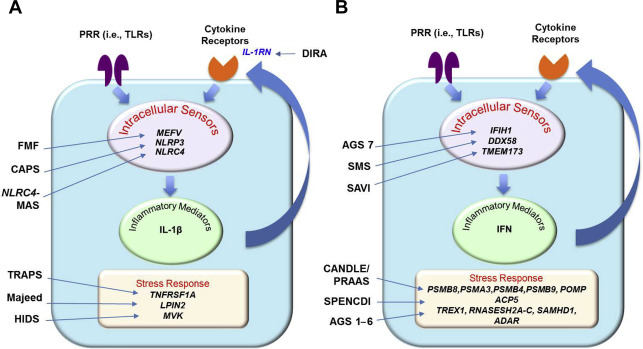 IL-1-mediated and IFN Type I –mediated autoinflammatory diseases (AIDs) and their genetic causes. ( A ) IL-1-mediated. ( B ) Type I IFN-mediated. AGS 1-6, Aicardi–Goutières syndrome 1-6; AGS 7, Aicardi–Goutières syndrome 7; CANDLE, chronic atypical neutrophilic dermatosis with lipodystrophy and elevated temperature; CAPS, cryopyrin-associated periodic syndrome (including the severity specrtum of FCAS, familial cold autoinflammatory syndrome; MWS, muckle–wells syndrome; NOMID, neonatal-onset multisystem inflammatory disease); DIRA, deficiency of interleukin-1 receptor antagonist; FMF, familial Mediterranean fever; MKD, mevalonate kinase deficiency or HIDS, hyperimmunoglobulinemia D and periodic fever syndrome; NLRC4 -MAS, NLRC4-associated macrophage activation syndrome which is also IL-18 mediated; PRAAS, proteasome-associated autoinflammatory syndrome; PRR, Pattern recognition receptor; SAVI, STING-associated vasculopathy with onset in infancy; SMS, Singleton–Merten syndrome; SPENCDI, Spodyloenchondrodysplasia with immune dysregulation; TLRs, toll-like receptors; TRAPS, TNF receptor-associated periodic syndrome.