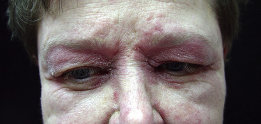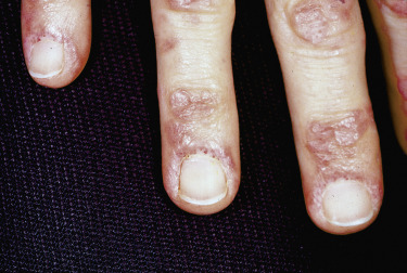 The heliotrope eruption consists of a dusky erythematous to violaceous cutaneous eruption with or without edema involving the periorbital skin in a symmetric distribution ( Fig. 2-1 ). Often only the upper lid is involved. Sometimes this sign is subtle and may involve only faint erythema along the eyelid margin. Gottron’s papules are found over bony prominences, particularly the metacarpophalangeal joints, the proximal interphalangeal joints, and/or the distal interphalangeal joints. They may also be found over bony prominences such as the elbows, knees, and feet. The lesions consist of slightly elevated erythematous to violaceous papules and plaques ( Figs. 2-2 and 2-3 ); they often contain telangiectases, and there may be hyper- and/or hypopigmentation. These lesions can be clinically confused with those of lupus erythematosus or, at times, with those of papulosquamous disorders such as psoriasis or lichen planus. In instances in which differentiation is difficult, a biopsy is warranted; however, the features of dermatomyositis are indistinguishable from those of cutaneous lupus erythematosus. Gottron’s sign typically refers to violaceous erythema over the areas where Gottron’s papules tend to occur.