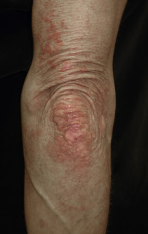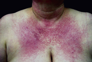 The characteristic and possibly pathognomonic cutaneous features of dermatomyositis are the heliotrope eruption and Gottron’s papules. Several other cutaneous features that occur in patients with dermatomyositis are characteristic of the disease but are not pathognomonic. These include midfacial erythema that involves the nasolabial folds (as opposed to the malar erythema in lupus erythematosus, which spares the nasolabial folds), poikiloderma in a photosensitive distribution on the chest (“V-neck” sign) or back (shawl sign), a violaceous erythema on the extensor surfaces, alopecia with or without scaly poikilodermatous changes, a scaly poikilodermatous rash on the lateral thighs (Holster sign), and periungual and cuticular changes. The cutaneous disease in dermatomyositis is photodistributed and often photoaggravated. In addition, pruritus may be a prominent feature in dermatomyositis, and may be helpful in clinically distinguishing this entity from lupus erythematosus. Quality-of-life impairment in dermatomyositis is greater than in other skin diseases, including both psoriasis and atopic dermatitis, based on its cutaneous manifestations alone. Notably, the cutaneous manifestations of dermatomyositis can follow the course of the myositis or can be discordant from the muscle disease activity. Reactivation of any skin manifestation of dermatomyositis in a patient otherwise considered to be in remission may signify a relapse of the myositis. Most often, however, the activity of the muscle disease is not reflected by that of the cutaneous disease.