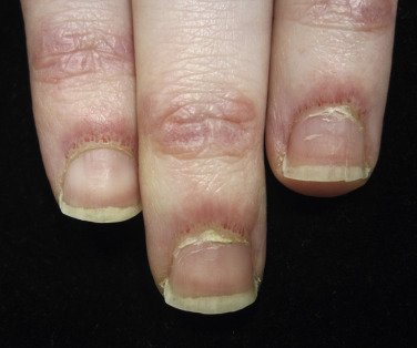 Nailfold changes consist of periungual telangiectases (consisting of both dilated capillary loops and capillary dropout), cuticular hypertrophy, and small hemorrhagic infarcts within this hypertrophic area ( Fig. 2-4 ). The periungual telangiectases may be clinically apparent or may be appreciated only by capillary microscopy. Clinically, they may closely resemble those seen in other connective tissue diseases. The cuticular overgrowth may be similar to that seen in scleroderma.