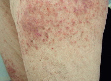Poikiloderma can occur on any photodistributed site, most classically the upper chest and neck (“V-neck” sign) and the upper back (shawl sign) ( Fig. 2-5 ), but also on the extensor surfaces of the arms and within Gottron’s papules on the dorsal hands. This photosensitive poikilodermatous eruption must be differentiated from lupus erythematosus and from other diseases that cause poikilodermatous skin changes. In addition, poikilodermatous changes may also occur on the lateral thighs, known as the “holster sign” ( Fig. 2-6 ).