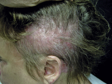Scalp involvement in dermatomyositis is relatively common. Mild to moderate nonscarring alopecia ( Fig. 2-7 ) can occur in some patients and often follows a flare of the disease. In addition, the scalp is often diffusely affected by scaling and erythema with poikilodermatous features, which can result in intense scalp pruritus. The scalp pruritus is often severe, and the symptoms often are greater than one might appreciate from the clinical findings. Clinical distinction from seborrheic dermatitis or psoriasis may be challenging, but histopathologic evaluation is helpful.