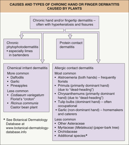 The term “protein contact dermatitis” is used to describe a chronic dermatitis in which patch tests are typically negative but prick tests to large protein allergens are positive . Patients develop a chronic dermatitis that acutely urticates within minutes of contact with the offending allergen. This is one of multiple mechanisms by which plants can cause chronic hand and fingertip eczema ( Fig. 17.1 ).
