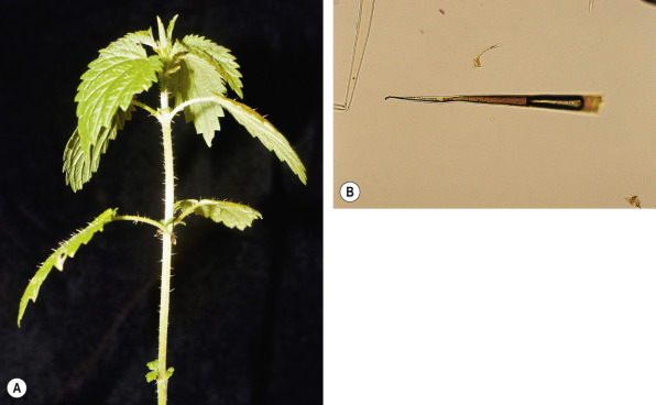 Inciting plants possess sharp hairs (trichomes) on leaves and stems (see Fig. 17.2A ). The proximal silicaceous hair is attached to a distal calcified portion that possesses a terminal bulb. When rubbed against, the bulb dislodges to reveal a beveled, hypodermic needle-like, hollow hair ( Fig. 17.2B ). The latter releases an irritant chemical cocktail (histamine, acetylcholine, serotonin) that supposedly serves as a defense mechanism against herbivores.