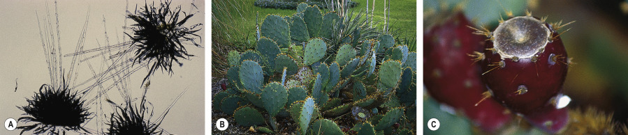 One form of glochid dermatitis from prickly pears ( Opuntia spp.) is “Sabra dermatitis”, a pruritic, papular eruption that occurs among prickly-pear pickers and those who unwarily stumble into burglar-proof hedges of this native Mexican plant ( Fig. 17.3B ). The fruit contains the highest concentration of glochids ( Fig. 17.3C ) and the ensuing eruption can resemble fiberglass dermatitis or scabies. Prickly pears should be picked only when wetted, and harvesting should cease when it is windy, since the glochids can become airborne.