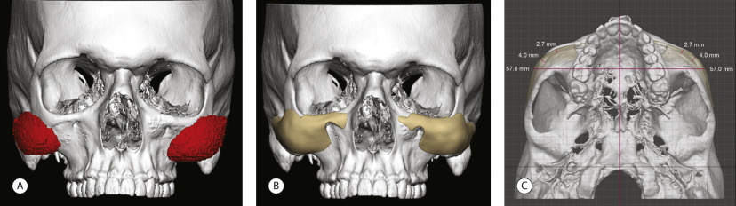 The precise fit of the CAD/CAM implant to the underlying skeletal contour makes for a more predictable result. There is a fundamental technical problem to placing off-the-shelf bilateral implants in similar positions on opposite sides of the face ( Fig. 14.3 ). Remote incisions routinely provide limited access and therefore limited exposure of the areas to be augmented. Furthermore, the surgeon never has the ability to see the position of both implants in a single view. CAD/CAM implants are made to augment precisely defined areas of the facial skeleton, making implant positioning less problematic. These implants can also be designed with registration features, for example, a flange on a malar implant that rests on the infraorbital rim or on the superior edge of the zygomatic arch. Custom implants are designed to avoid any gaps between the posterior surface of the implant and the anterior surface of the skeleton ( Fig. 14.4 ). Gaps are unavoidable when using off-the-shelf implants. These gaps add to the effective projection of the implant. A 2-mm gap beneath a 3-mm implant will result in an unanticipated 5-mm projection. An implant designed and manufactured to have its posterior surface mirror that of the underlying skeleton will avoid that unanticipated contour result.