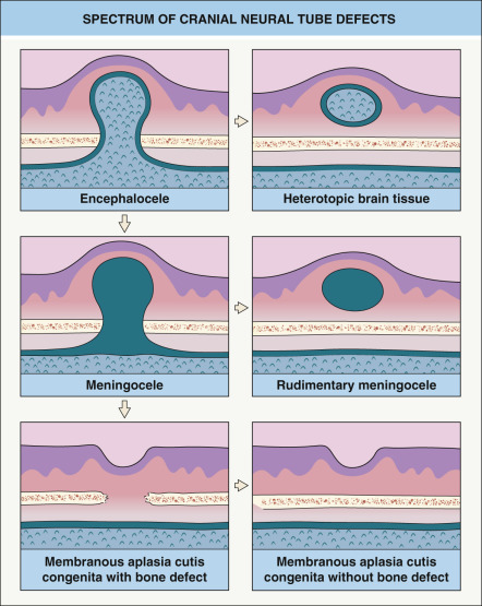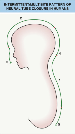 Classically, closure of the human neural tube was thought to be a continuous process, beginning at a single focus in the cervical region and progressing bidirectionally in a “zipper-like” fashion to culminate in the closure of the anterior and subsequently posterior neuropores. However, evidence suggests that in humans as well as other mammals, the cranial segment of the neural tube closes in an intermittent or multisite pattern. Four distinct initiation sites of neural tube closure have been identified in the mouse, and a similar pattern of closure has been proposed for humans, with an additional caudal site ( Fig. 64.1 ) . In support of the multisite closure model, neural tube defects (e.g. cephaloceles, myelomeningoceles, heterotopic brain/meningeal tissue) cluster either entirely within one closure site or at the junction of two sites, such as the nasal root (2–3) or vertex (2–4; see Fig. 64.1 ). Neural tube closure in the posterior cranial area is thought to occur via a membrane rather than a midline fusion of folds, and the appearance of this site during embryologic development in animals resembles that of human membranous aplasia cutis . Specific genes may control individual closure sites, explaining repetitive events within families.