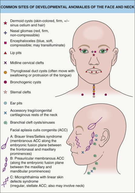 This chapter begins with an overview of the midline lesion and its relationship to closure of the neural tube. A discussion of specific issues pertaining to midline lesions of the nose, scalp and spine follows, including a review of the different types of anomalies that can present in these sites. An overview of aplasia cutis congenita is followed by presentation of a clinical approach based on the morphology and distribution of lesions and the presence or absence of associated abnormalities. Finally, a variety of non-midline developmental anomalies are discussed, including lip pits, accessory tragi, supernumerary nipples, skin dimples, malformations of the dermatoglyphs, rudimentary supernumerary digits, and the amniotic band sequence. Developmental anomalies that are covered in Chapter 110 include ear pits as well as branchial cleft, thyroglossal duct, bronchogenic, median raphe, omphalomesenteric duct, and urachal cysts.