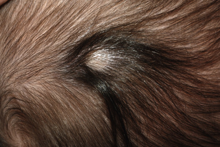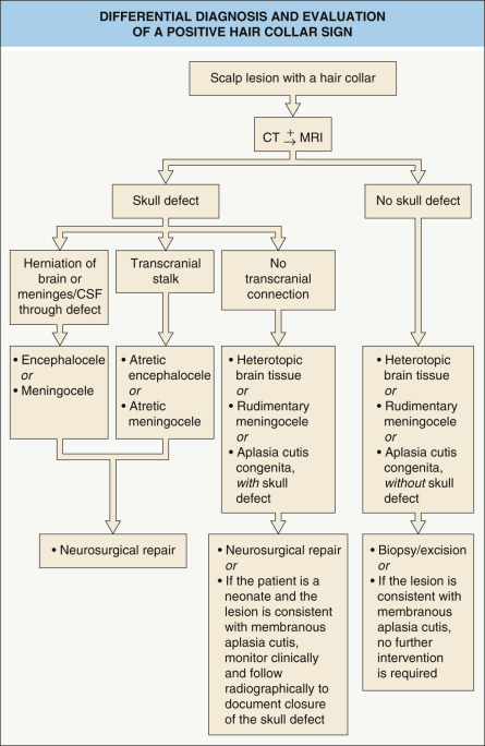 The hair collar sign consists of a ring of long, dark, coarse hair surrounding a congenital scalp nodule. The presence of a hair collar is a relatively specific marker for ectopic neural tissue . Hair collars are also seen in membranous aplasia cutis ( Figs 64.3 & 64.4 ), a disorder thought to represent a forme fruste of a neural tube defect (i.e. without the presence of ectopic neural tissue) . Drolet et al. hypothesized that cerebral herniation produces aberrant shearing forces during the formation of hair follicles early in development, causing them to point outward from the defect. The proximity of neuroectoderm expressing neural adhesion molecules may also alter normal epidermal–dermal interactions, thereby inducing the development of large, abnormal follicles . These speculations correlate with the histologic and dermoscopic finding of numerous horizontally oriented, hypertrophic follicles emerging from the edge of scalp lesions to form the hair collar . The differential diagnosis and evaluation of a positive hair collar sign is presented in Fig. 64.5 .