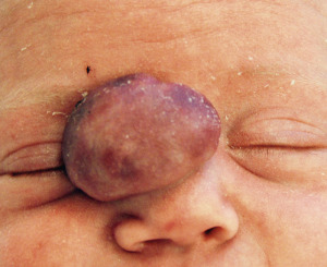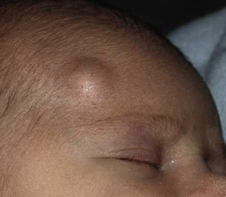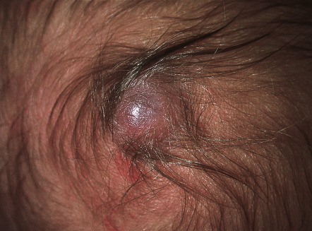 Heterotopic brain tissue and rudimentary meningoceles typically present as a 1–4 cm solid or cystic subcutaneous nodule, often with a blue–red hue. Occasionally, rudimentary meningoceles have a bullous appearance and are clinically indistinguishable from membranous aplasia cutis . Lesions are often located in the midline occipital or parietal scalp, where they can manifest with alopecia of the overlying skin and/or a surrounding hair collar. An overlying capillary malformation also may be present.