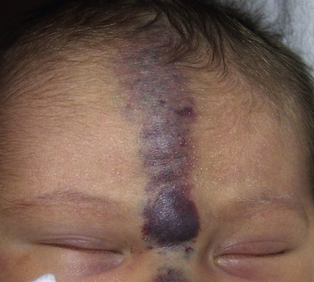 Sinus pericranii is a rare disorder characterized by a congenital, or occasionally acquired, epicranial venous malformation of the scalp that communicates with an intracranial dural sinus through dilated diploic cranial veins . The lesion is usually located near the midline, especially in the frontal region. Most are asymptomatic and appear as a compressible, fluctuant mass that varies in size with changes in intracranial pressure ( Fig. 64.6 ). The differential diagnosis includes a simple venous or arteriovenous malformation, meningocele or encephalocele.
