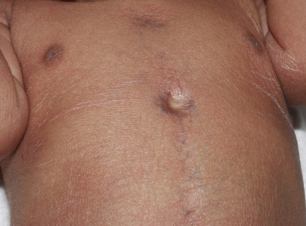 Sternal clefts are rare congenital malformations that result from defective embryologic fusion of paired mesodermal bands in the ventral midline. These lesions most frequently involve the superior sternum, but inferior clefts and a complete bifid sternum can also occur. The skin overlying sternal clefts may be atrophic ( Fig. 64.10 ), scarred or ulcerated, and a dermal sinus tract is occasionally present. Approximately 40% of sternal clefts are associated with PHACE(S) syndrome ( p osterior fossa malformations; h emangiomas; a rterial, c ardiac and e ye anomalies; s ternal cleft/ s upraumbilical raphe; see Ch. 103 ) . The sternal abnormality in PHACE(S) syndrome may be limited to cutaneous atrophy or a pit in the presternal area, with intact underlying bone . For sternal clefts associated with a substantial bony defect, surgical repair can be performed to protect the mediastinal organs and improve respiration as well as cosmesis. A supraumbilical raphe is a rare midline abdominal defect that presents as a firm, scar-like, linear protuberance extending cephalad from the umbilicus. Supraumbilical raphae often occur in association with sternal clefts, sometimes simultaneously as manifestations of PHACE(S) syndrome.