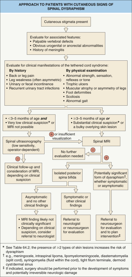 Cutaneous lesions of the spinal axis that should alert the clinician to the possibility of dysraphism are summarized in Table 64.2 . In one study , 39% (22/56) of neonates with “high-risk” stigmata such as hypertrichosis, subcutaneous masses, infantile hemangiomas, tails, or dimples above the gluteal cleft were found to have spinal dysraphism (see Figs 64.13 & 64.14 ). The presence of two or more skin lesions is a particularly strong sign; in another series, 61% (11/18) of such patients had spinal dysraphism, compared to 8% (3/36) of those with only one skin lesion .
