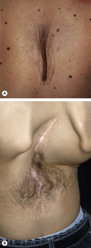 | Hypertrichosis | A V-shaped patch of long, coarse or silky hair (“faun tail”) ( Fig. 64.13 ) |