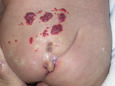 | Infantile hemangiomas | Superficial, usually segmental pattern ( Fig. 64.14 ), often ulcerated |
