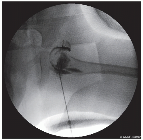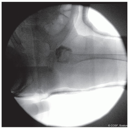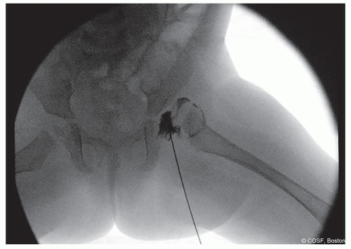 • Once in cast, if position of the hip is in question, after sterile swab of the exposed groin, you can repeat the arthrogram in cast (Figure 20.2)