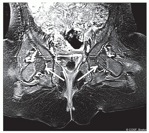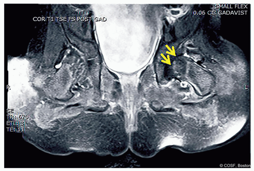 • Evidence suggests that “global decreased enhancement” of the femoral epiphysis and/or hip abduction in cast greater than 60° correlates with the development of PFGD2 (Figures 20.10 and 20.11)