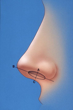 Gunter and colleagues proposed a classification for alar-columellar discrepancies, which defines the normal alar columellar relationship based on a line drawn through the most anterior and posterior points of the nostril on the lateral view ( Fig. 1 ). The nostril represents an oval in which the alar rim forms the upper border of the nostril and the columellar rim, at the junction of the external skin with the vestibular skin, forms the lower border of the nostril. This oval is occasionally interrupted by flaring of the feet of the medial cura, but this should be disregarded when analyzing the relationship. In a normal alar-columellar relationship, the greatest distance from the long axis of the nostril to the alar rim or the columellar rim should be 1 to 2 mm.