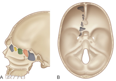The anterior skull base is formed by the confluence of the frontal, ethmoid, and sphenoid bones with their corresponding paranasal sinuses being the most common sources of CSF rhinorrhea given their intimate relationship with the basal dura of the frontal lobes (see Fig. 1.6.1 ).