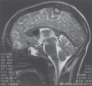 MRI appearance of skull base CSF leaks. Sagittal T2-weighted MRI illustrating CSF accumulation into the sphenoid sinus.
