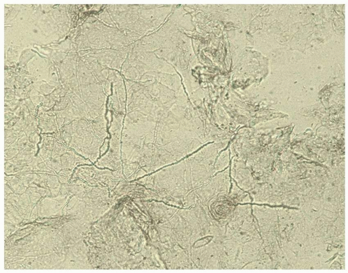 ![]() FIG. 4.1. Dermatophytosis of tinea cruris shows hyphae similar to candidiasis, but there are no budding yeast; the hyphae are long, branching, and cross cell membranes. |