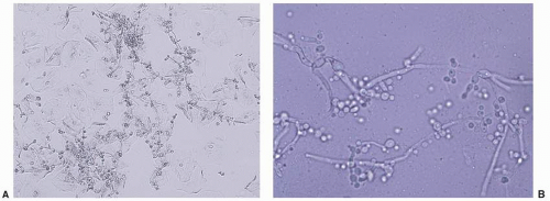 ![]() FIG. 4.2. A and B. The hyphae and pseudohyphae of dermatophytosis and candidiasis are nearly indistinguishable, but on this higher power, budding yeast often can be seen in candidiasis. |