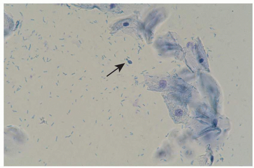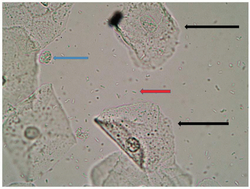 A microscopic evaluation of vaginal secretions using normal saline under a coverslip permits an evaluation of the morphology of cells, a screen for inflammation and estrogen effect, and a crude survey of colonizing and infecting organisms. Information from an examination of vaginal secretions is sometimes extremely important in the evaluation of the vulva and vagina, and recording results in a grid helps ensure that all aspects of the wet mount are evaluated (Table 4.1). Secretions are collected as described above for evaluation for Candida spp. However, the secretions are transferred from the cotton-tipped applicator by touching (if abundant) or gently rolling (if scant) onto the glass slide. Care should be taken to avoid the thick application of secretions, which interferes with visualization. Some clinicians prefer inserting the cotton-tipped applicator into a test tube and adding a few drops of saline to dilute the secretions and separate the cells to better evaluate the morphology. This author has tried both methods but has found that the evaluation of white blood cells is problematic when the vaginal secretions are first diluted. The proportion of white blood cells per epithelial cell, a standard method of measurement, is far lower with diluted specimens compared to undiluted specimens.