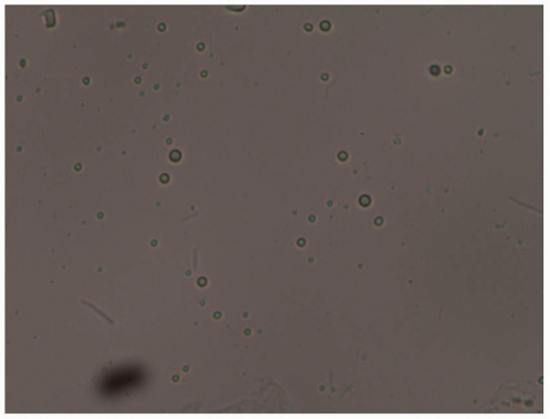 ![]() FIG. 4.4. The lack of mycelia on wet mounts of non-albicans Candida can make this diagnosis more challenging. These forms of yeast exhibit only budding yeast (arrow). |