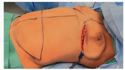 The patient is positioned supine with the arms abducted 90 degrees on arm boards. Alternatively, if no axillary lymph node surgery is planned, the arms may be tucked. This allows for easier positioning of a dual head operating microscope for two surgeons, but care must be taken not to injure the patient’s hands and arms when raising the patient’s head and back to close the abdominal donor site.