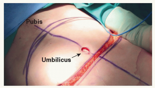 The lower transverse abdominal incision is also marked preoperatively with the patient standing. This is typically drawn in the natural suprapubic crease and extends laterally, curving gently upward to meet the superior incision line several centimeters superior and lateral to the ASIS (see FIGS 2 and 3).