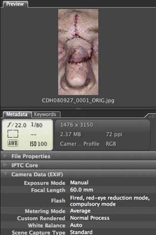 Assignment of metadata is arguably the most critical step in DAM. Until metadata is assigned to files, no efficient means exist to locate a desired digital image. Peter Krogh, a professional photographer and DAM expert, defines metadata as “data about data” and designates it the most valuable file tracking and retrieval tool for photographers. For photographers—and for surgeons as well—metadata is any information that is associated with a digital image. An image can be associated with information, or metadata, in a manner that maintains the metadata as an embedded part of the image file; this ensures that the metadata follows the digital images regardless of the application software or operating system used to access them. There are 2 basic classes of metadata. The most basic metadata such as date and camera settings are automatically generated each time an image is captured. These basic data are known as EXIF, or exchangeable image file format, which has been adopted and standardized by camera manufacturers. EXIF data as displayed in Adobe Bridge CS3 (Adobe Systems Inc, San Jose, CA, USA) are shown in Fig. 1 . Fig. 2 demonstrates other useful and automatically generated file information.