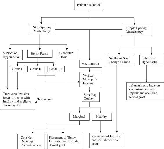 As stated previously, the quality of the skin flaps after mastectomy is a critical component for a successful outcome. Choosing the appropriately sized implant to fill the space beneath these flaps is also an important consideration. See the algorithm in Fig. 2 .
