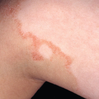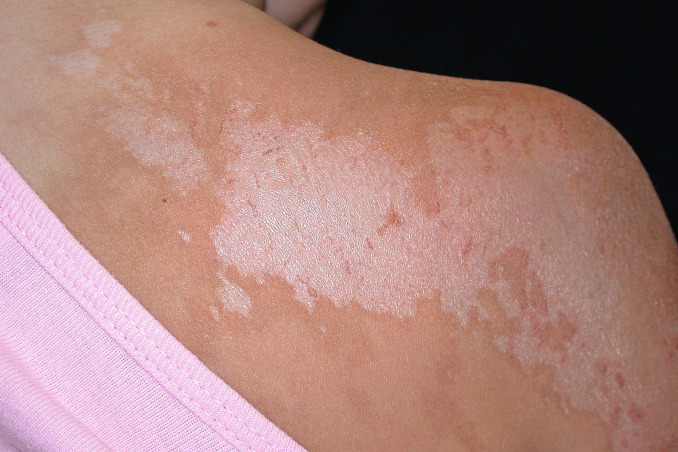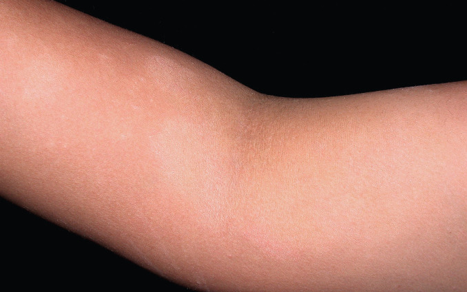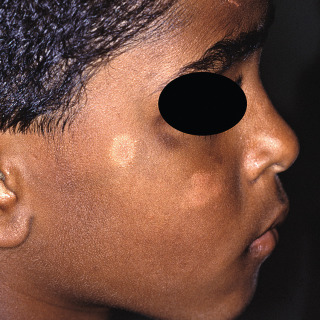 Mature lesions demonstrate ill-defined patchy hypopigmentation with round to oval areas, with a subtle fine white scale ( Figs. 27.5–27.7 ).