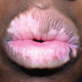 Patient with vitiligo of the mucosal surfaces of the lip demonstrating a sharp demarcation between depigmented areas and normal skin.