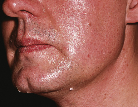 The parotid form appears weeks to months following surgery, trauma, or other disorder (e.g. abscess, herpes zoster) affecting the parotid gland. These patients experience vasodilation and sweating on the cheek and adjacent neck when salivary stimulation is induced by eating, drinking, or even chewing ( Fig. 39.3 ). Sweating most often occurs in the distribution of the auriculotemporal nerve; at times there is also unilateral localized pain .