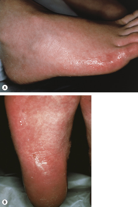 Main sites are volar (palms, soles) and axillary skin; the face may also be involved